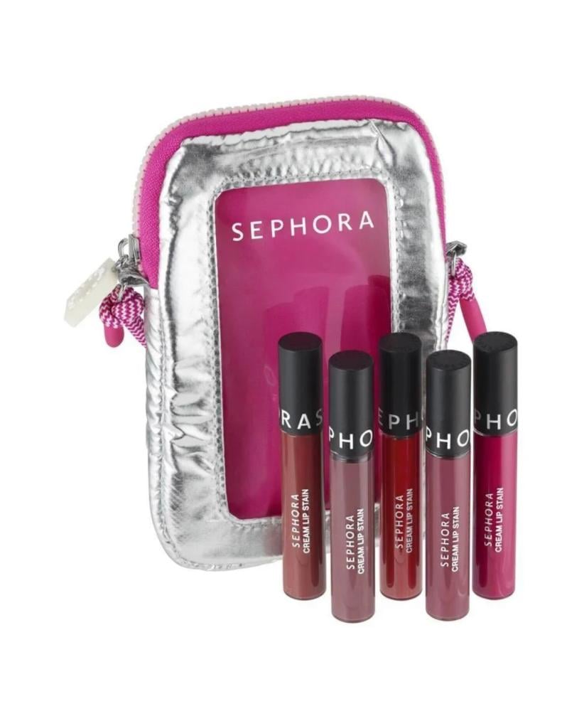 طقم الهدايا الأيقوني من مجموعة سيفورا، في شكل جديد احتفالي. تأتي مجموعة أحمر شفاه كريم ليب ستين الخاصة في حقيبة فضية اللون. وهي حقيبة أنيقة يمكنكِ أخذها معكِِ في أي مكان بفضل الحبل المُدمج بها. يمكنكِ أيضًا إعادة استخدامها كحافظة لهاتفك أو للإكسسوارات الصغيرة.